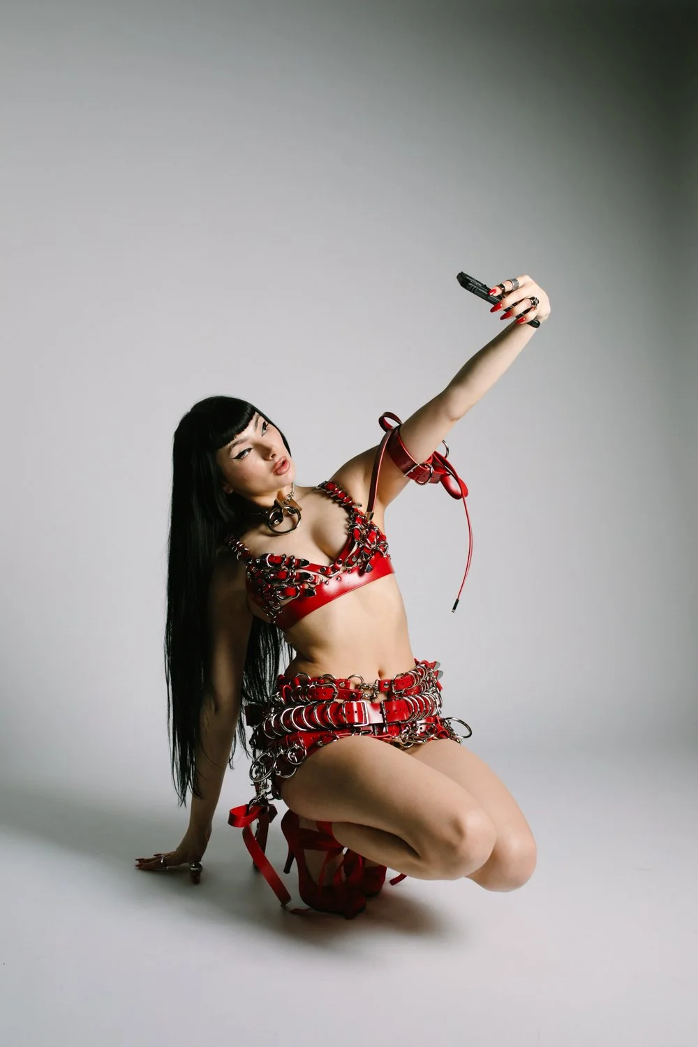 Obviously I love Creepy. I like the way her designs flatter your body. Sian Hoffman is another favorite - she does very classic fetish corsetry. The shaping is perfect. She’s very much into the old fetish illustration too - you can see it in the shaping of her designs. I love her. R&M Leathers make some of my favourite stuff, very inspired by vintage fetish styles and metal music. There’s this girl making chainmail called Catholic Guilt - their chainmail is just on another level. It’s incredible. And of course we shot gorgeous chainmail together by Cadena Y Rosas. Angelis Blade was a dear friend and she still makes really unique hand sculpted lingerie. Also, my new friend who I met and shot with in Paris - Human Chuo. She made these lingerie pieces hand drawn with a 3D pen, they took her weeks to make. She incorporated a little snail girl into the red design inspired by my slime project. I was very flattered.
